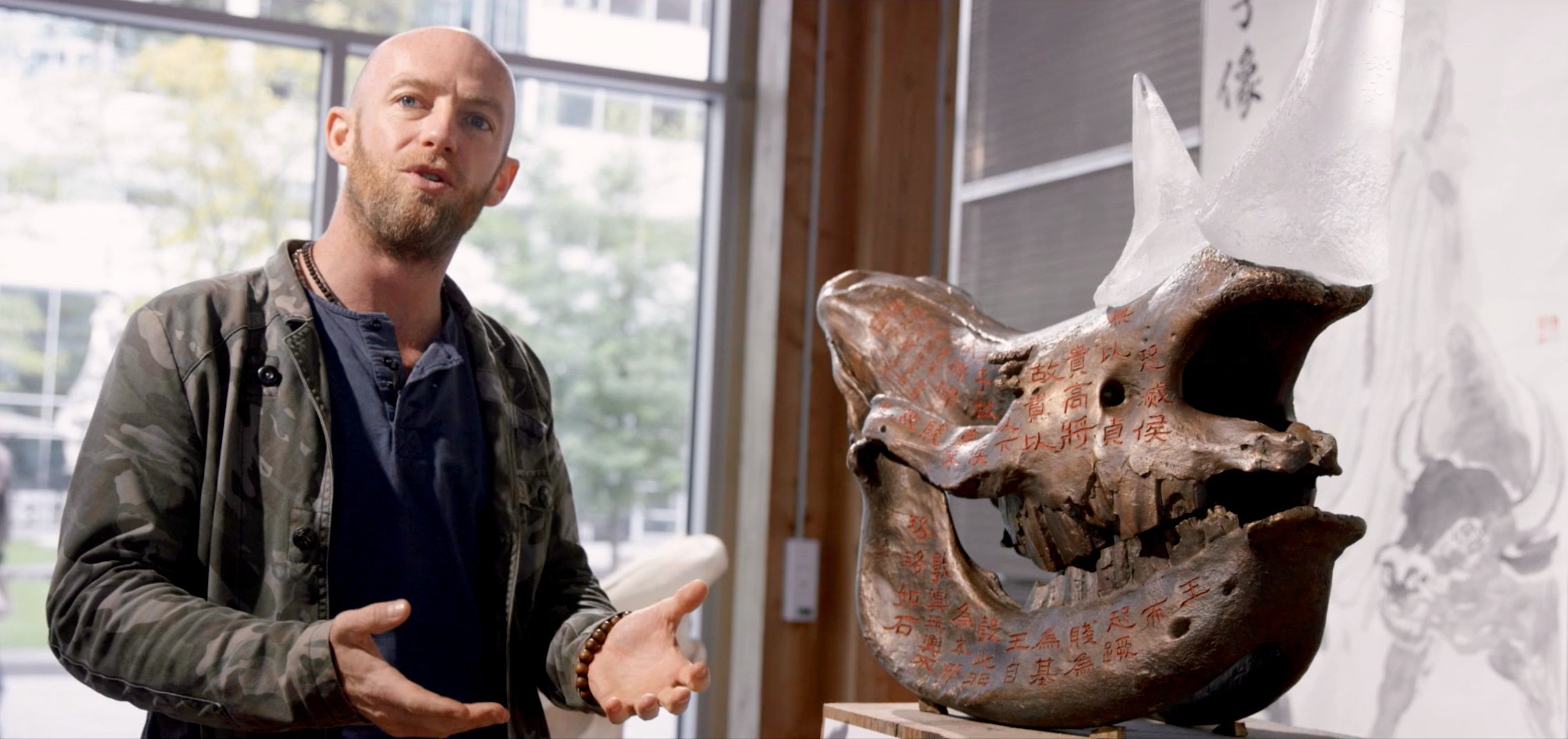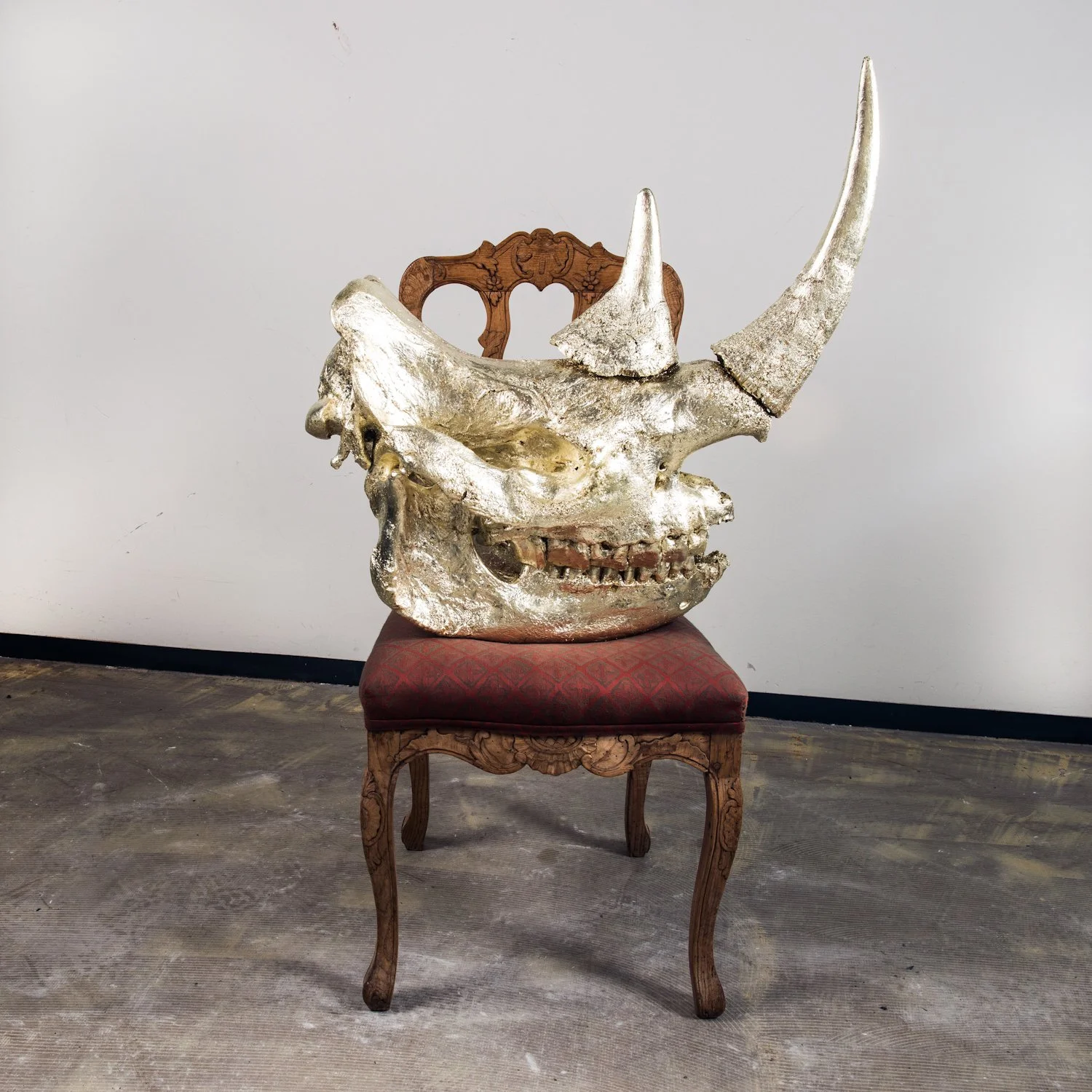 Vincent Mock uses contemporary art as a medium to raise awareness and communicate the poaching story, while also generating direct support for conservation. The skulls originate from Marakele Park, South Africa, where the artist previously worked managing a rhino breeding area. After witnessing the reality of poaching firsthand, he became determined to tell an activist conservation story through his work.
