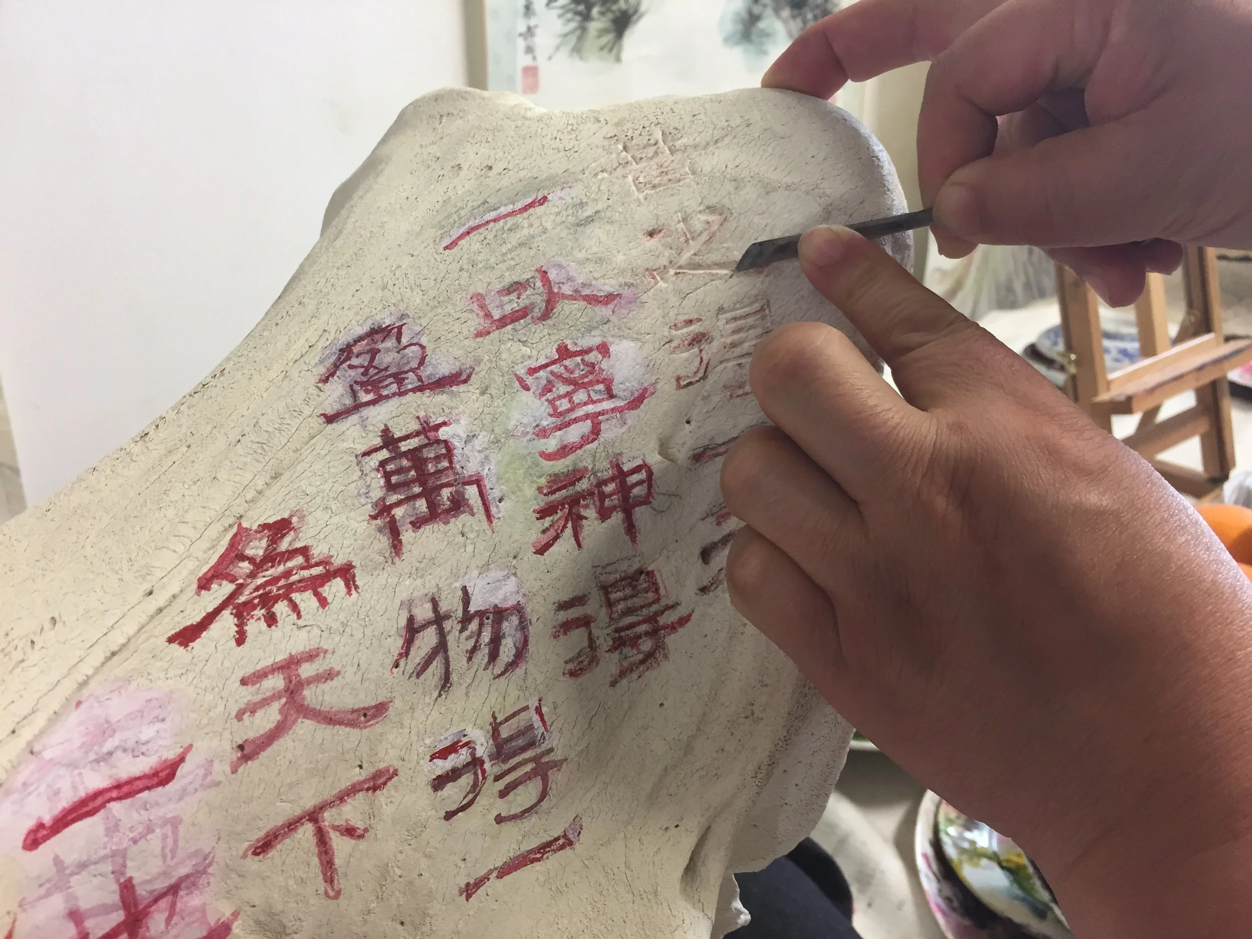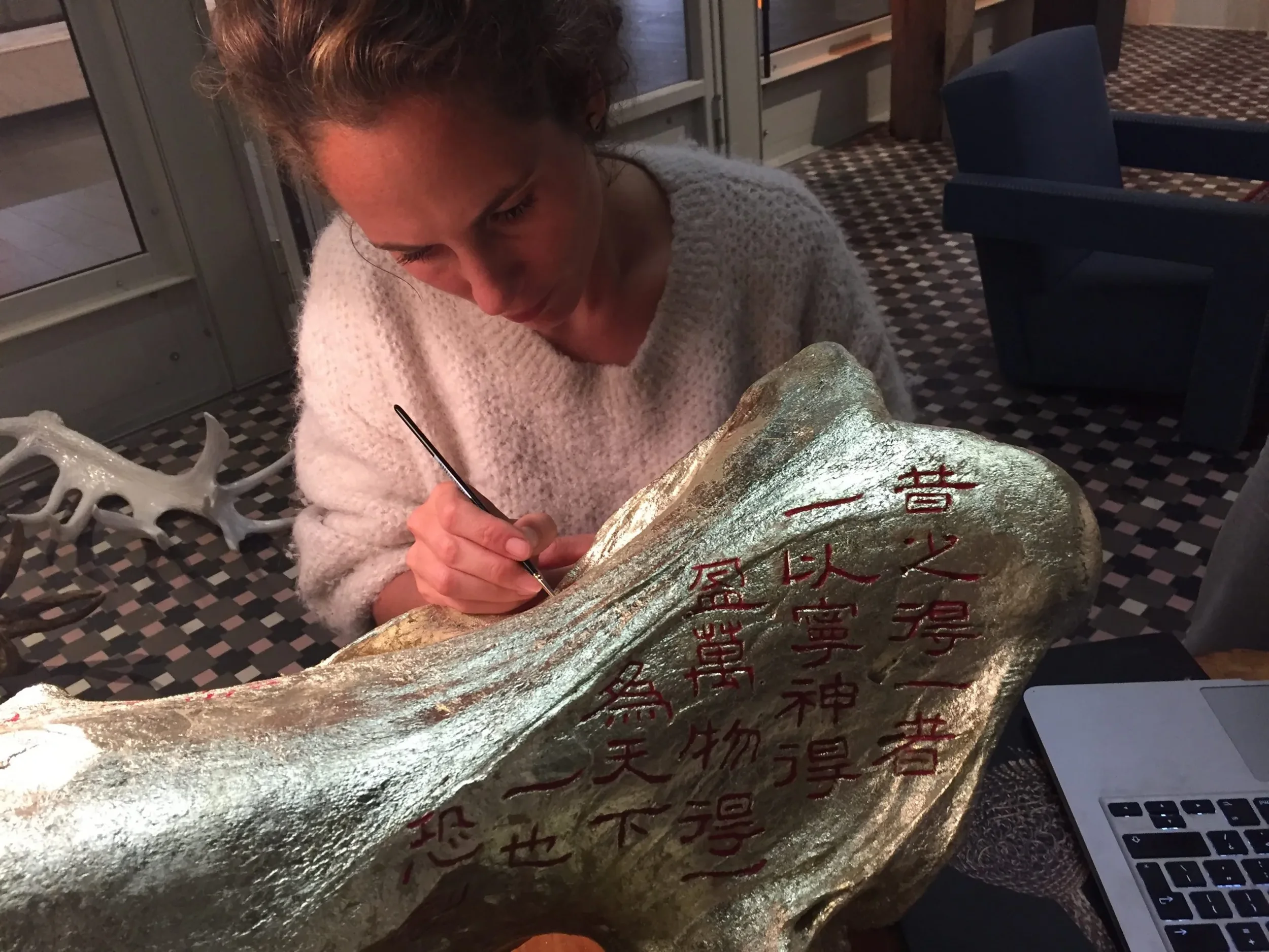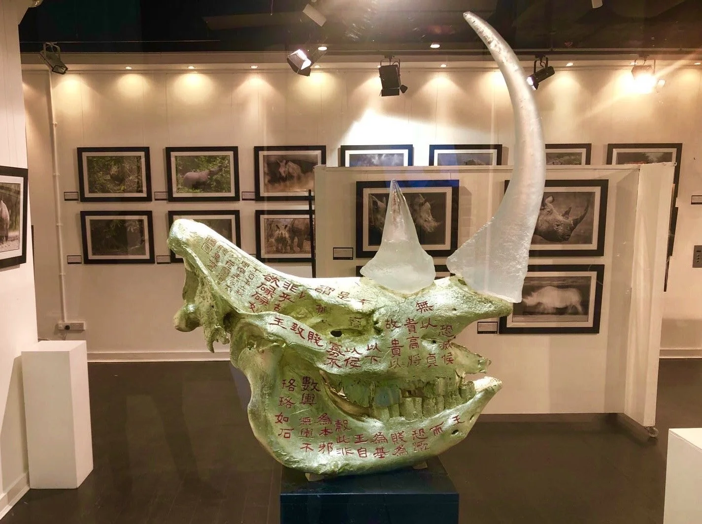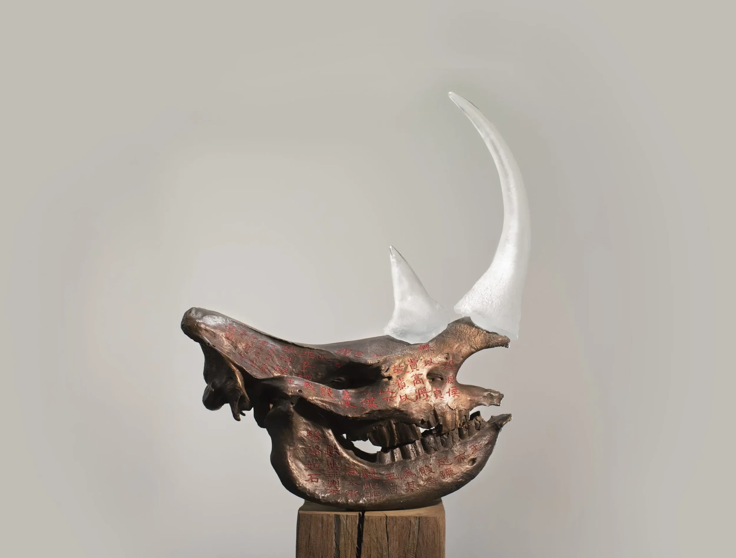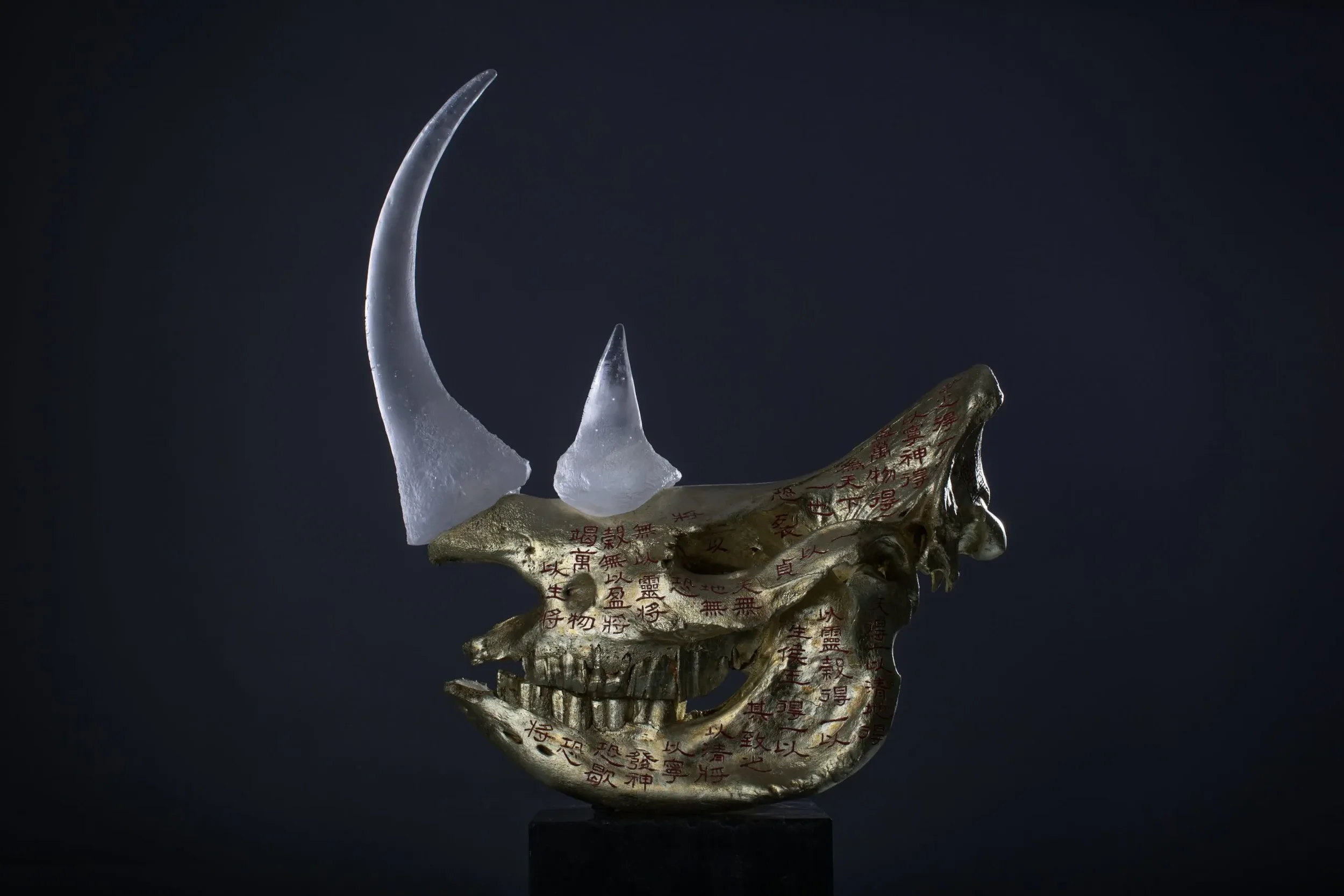 There are two variations of the work. One variation (a triptych) consists of real white rhino skulls covered in gold leaf and engraved by Chinese master calligrapher Zhou Le Sheng (1959) with an ancient text from the Tao Te Ching, originally written by Lao Tzu. The text expresses the essence of nature conservation, even though it was written more than two thousand years ago, when humans lived in far greater balance with their environment. The horns are made from semi-transparent cast glass, as if they are vanishing.