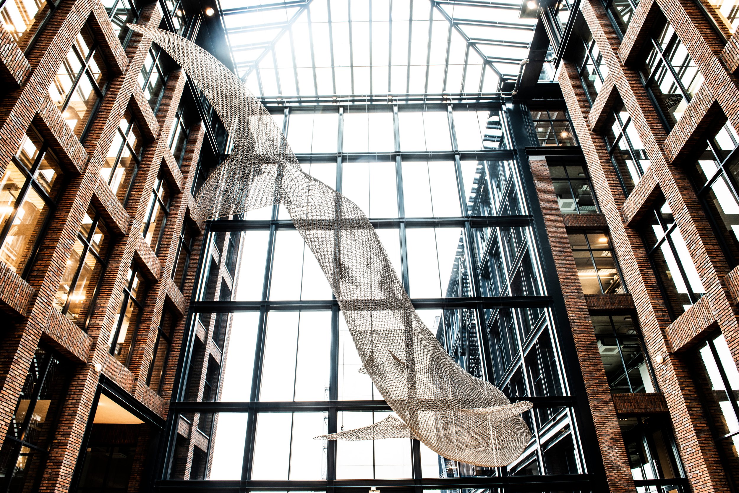 Vincent Mock’s 12-meter whale shark sculpture is a permanent installation that quite literally floats through the architecture of the space, suspended like a calm giant passing overhead. Built from thousands of individual elements, it transforms the atrium into an underwater scene in mid-air, playful from a distance and obsessively detailed up close. It’s both a spectacle and a quiet reminder of how fragile our oceans really are.