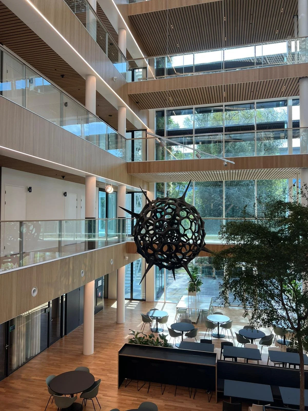 Vincent Mock’s monumental Radiolaria sculpture is exhibited in the atrium of Plus Ultra Utrecht, the newest and largest building at Utrecht Science Park. Measuring 3.5 meters in diameter and developed in collaboration with the University of Fribourg, the work transforms microscopic life into an architectural-scale experience, inviting visitors to reflect on sustainability, innovation, and the hidden structures that shape our world.