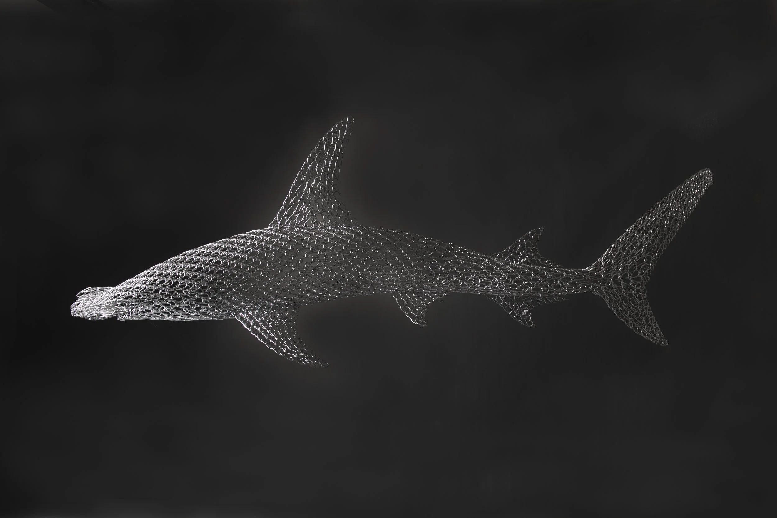 In this sculpture, the razor-sharp teeth and angular form of the hammerhead are accentuated by stainless steel fishhooks, each one echoing the danger and precision of the animal itself. What is inherently deadly is transformed into something unexpectedly graceful. The body curves subtly, with the tail gently bending, giving the impression of motion frozen mid-swim.