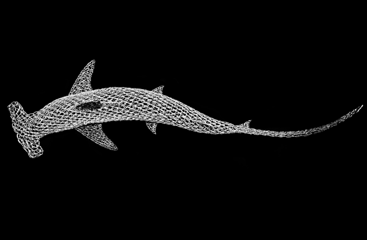 The scalloped hammerhead, known for its distinctive curved head and schooling behavior, became a natural focal point for this concept. In the sculpture, fishhooks are reassembled into a powerful yet fragile form, reflecting the tension between beauty and destruction, movement and entrapment.
