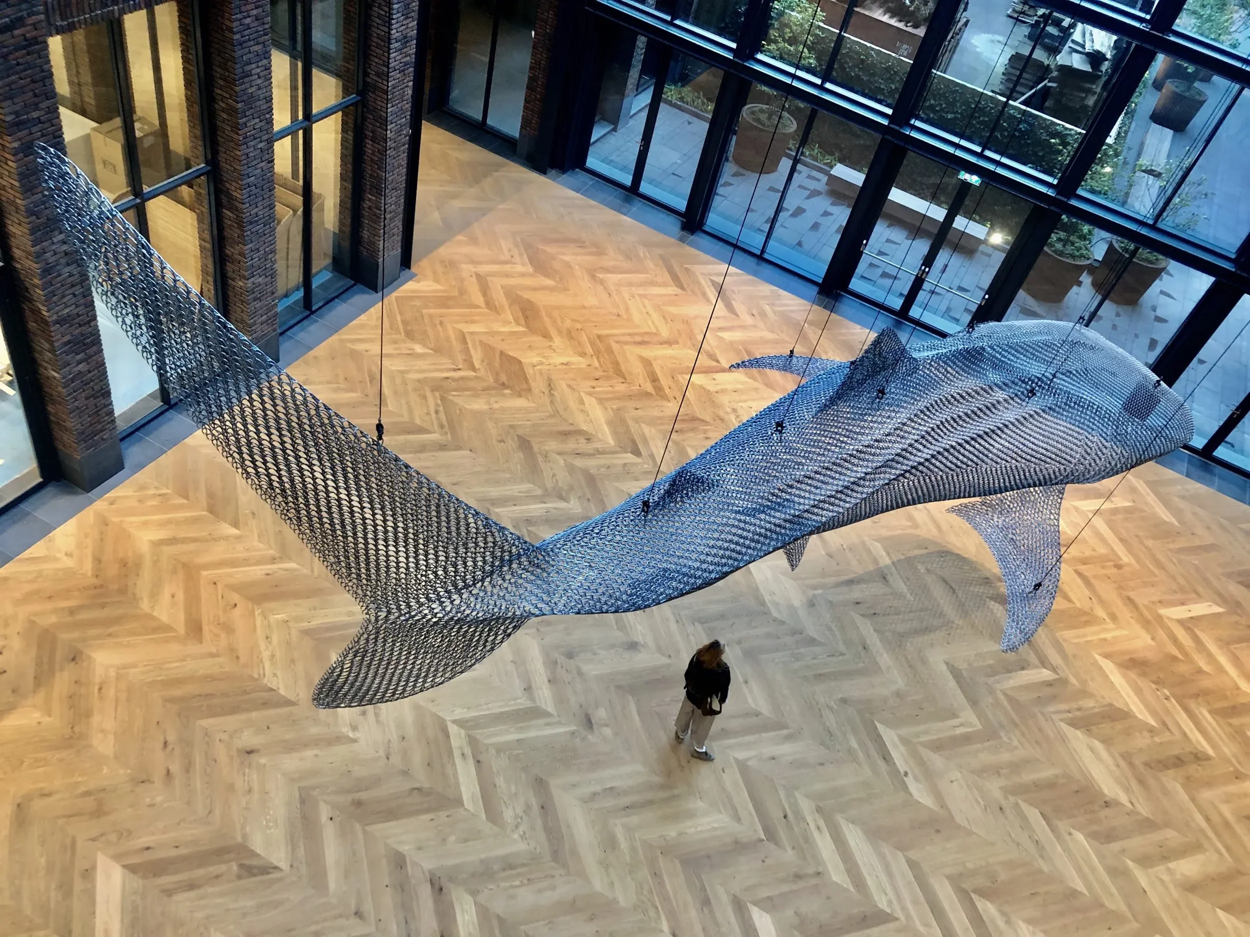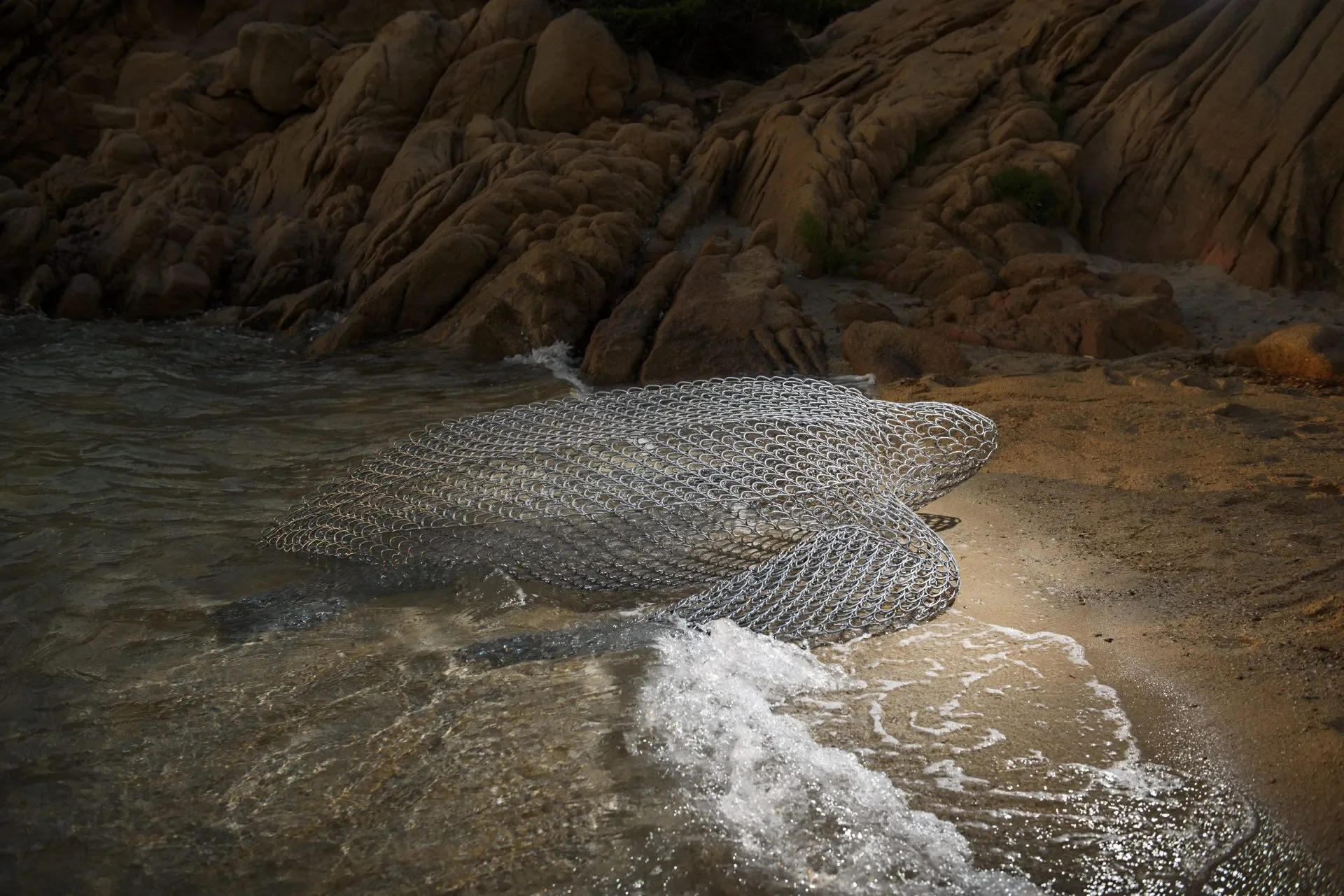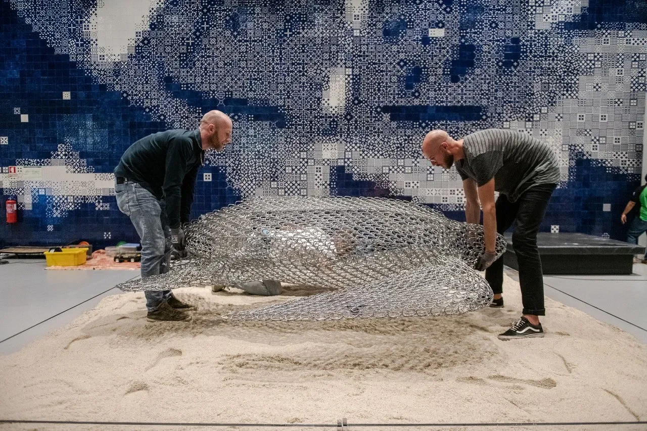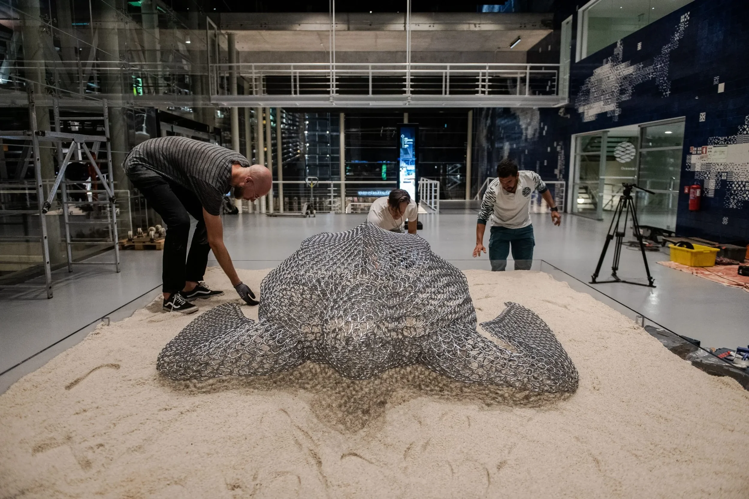 We chose to include the leatherback turtle in this installation because of its exceptional nature and the urgent story it carries. Constructed from approximately 2,500 TIG-welded stainless steel longline fishhooks, the sculpture transforms instruments of harm into a powerful tribute. Through this work, art becomes a means to reflect on human impact and to give presence to a species that urgently needs protection.