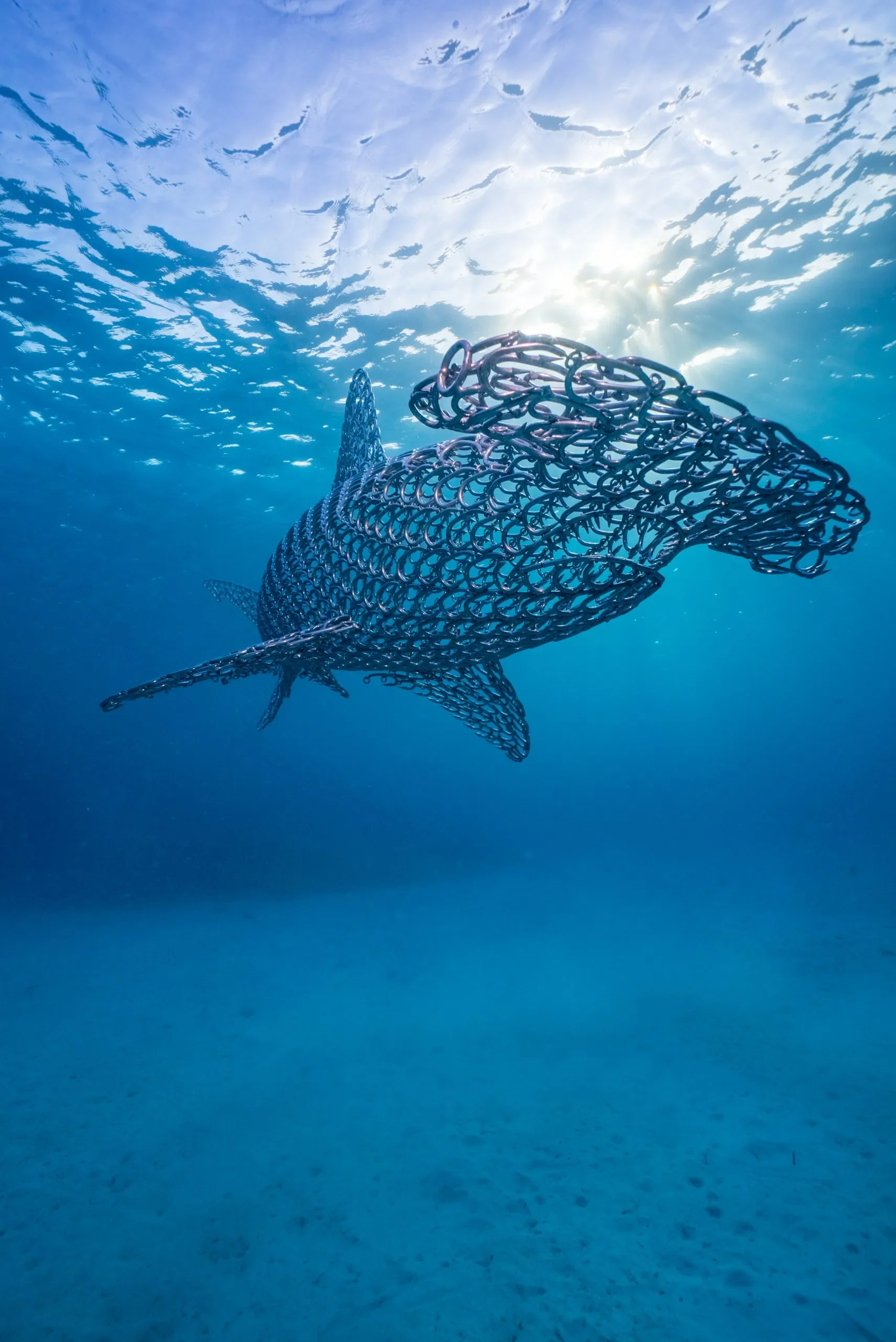 In this sculpture, Vincent Mock captures both the monumental scale and quiet dignity of the whale shark. Crafted from stainless steel longline fishhooks, the work reflects the tension between a creature shaped by ocean currents and the tools that symbolize human extraction. The shimmering surface echoes the movement of light underwater, transforming an ocean giant into a powerful reminder of the fragile balance between admiration and responsibility.
