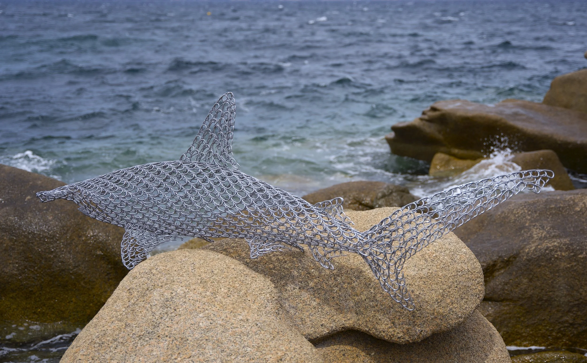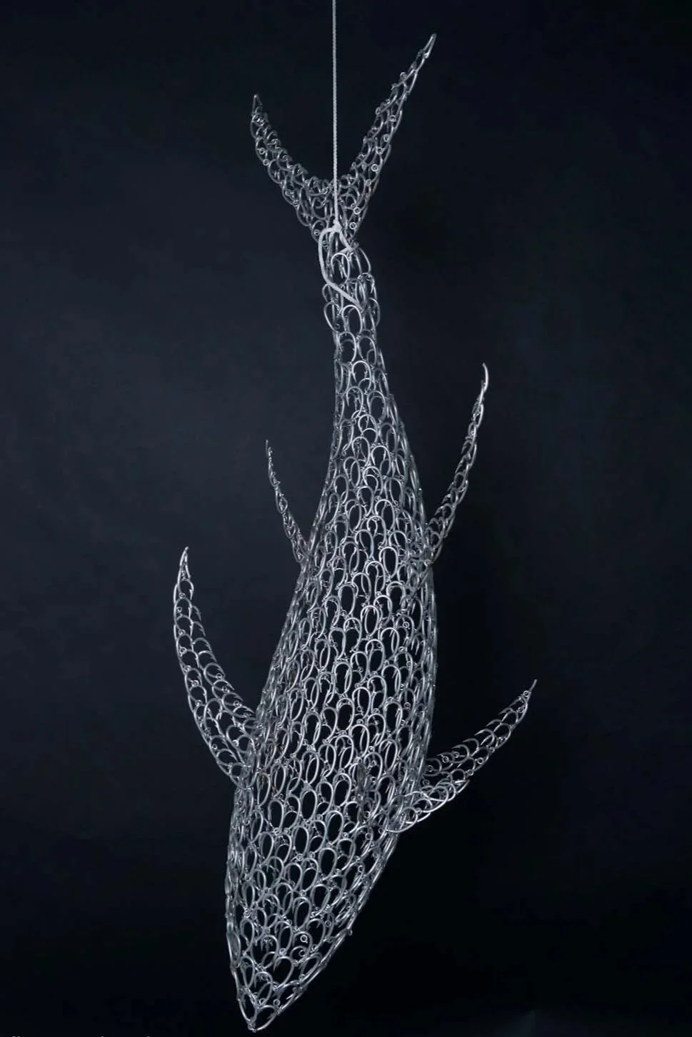 With this piece, Vincent Mock shapes a powerful marine predator from an unexpected and unsettling material: stainless steel longline fishhooks. The sculpture belongs to his Hooked On Life series, where the tools of fishing become both medium and message.
