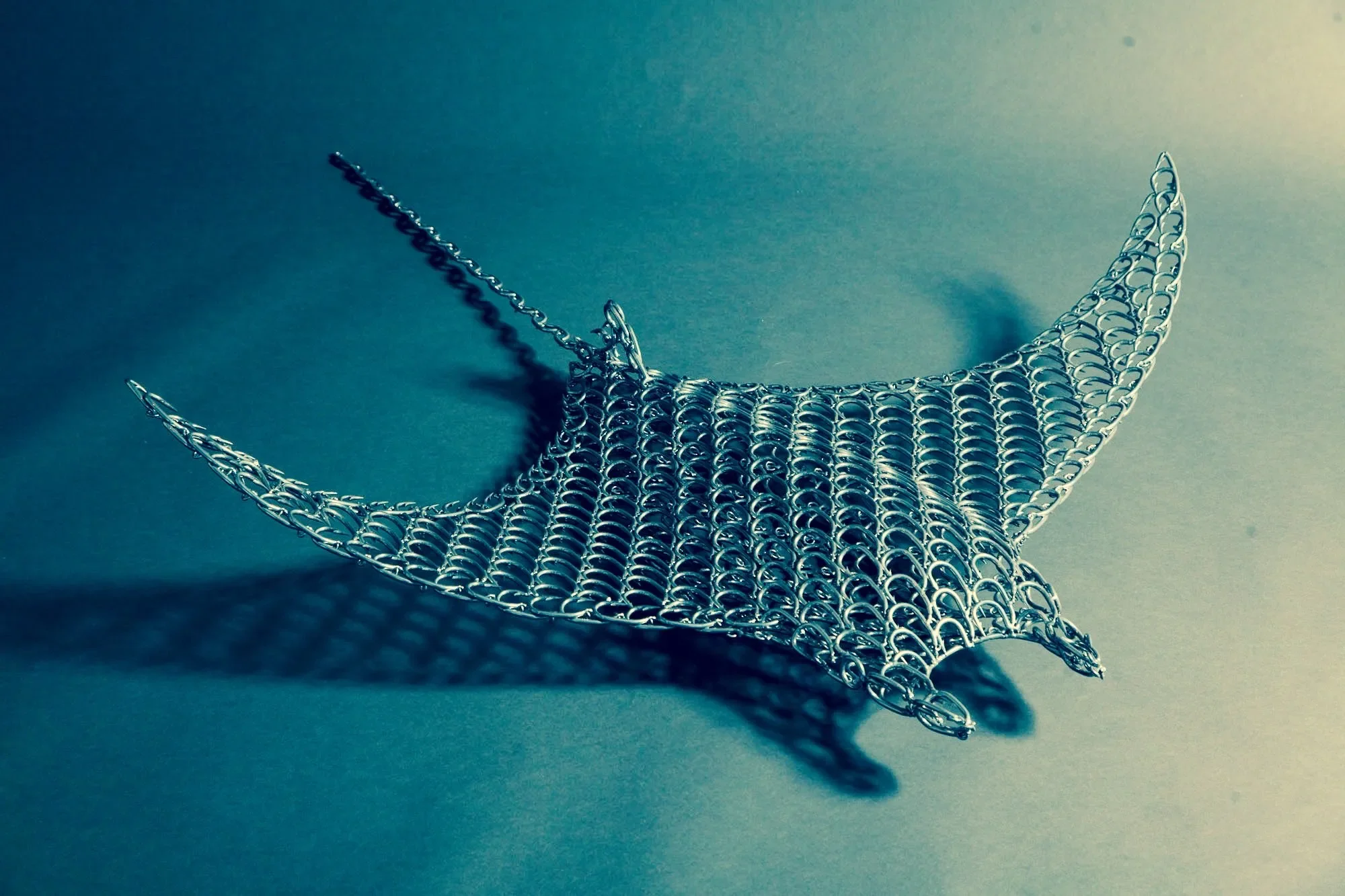These sculptural works are an ode to what we can still cherish of the natural wonders of our blue planet. By transforming stainless steel fishhooks into flowing, wing-like forms, the sculptures highlight both the beauty and vulnerability of manta rays. What appears light and graceful is constructed from materials that speak of danger and human impact.